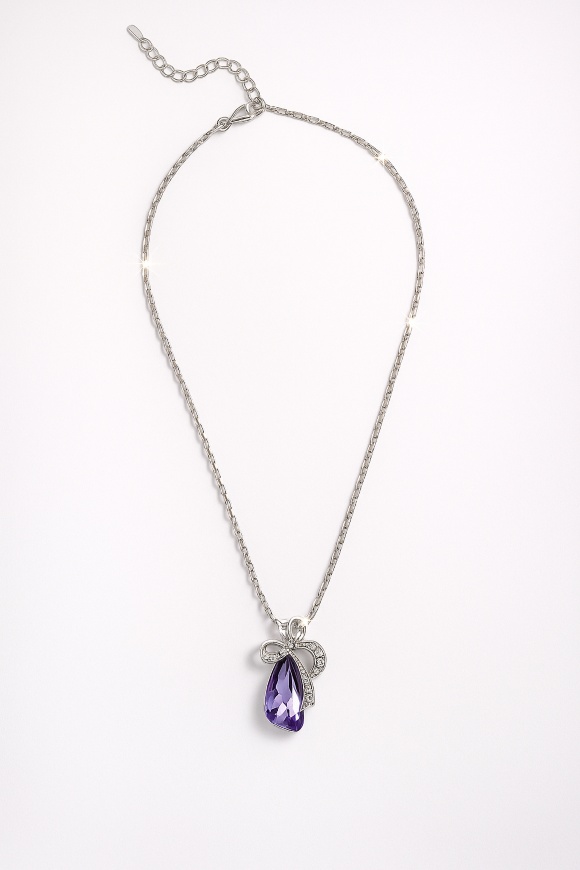 An elegant silver bow pendant necklace featuring a radiant teardrop violet stone—perfect for graceful everyday or evening wear.